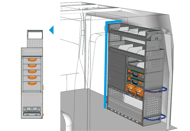Aménagements pour fourgon Sprinter L1 H1. Vous trouverez ici des exemples d’équipements pour véhicules utilitaires Mercedes-Benz Citan (Empattement 2697 mm ).
