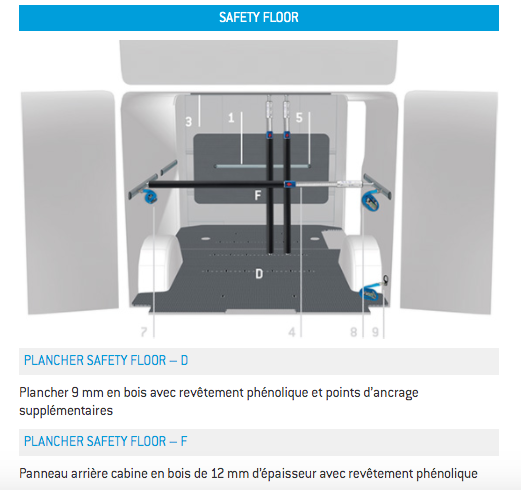 Plancher en bois marin multiplis à revêtement phénolique pour le sol du fourgon, panneaux en polypropylène alvéolaire pour les portes, les parois et la cloison de séparation, enjoliveurs pour les roues arrière : Store Van dispose de tout ce qui permet de protéger la tôle de l’espace de chargement des véhicules utilitaires Renault Trafic. Le plancher et les panneaux Store Van constituent également une excellente base pour l’arrimage de l’aménagement et du matériel transporté qui doit être fixé au moyen de barres d’arrimage du chargement, de courroies, d’anneaux et tous les équipements indiqués dans le catalogue de la « sécurité du chargement ».